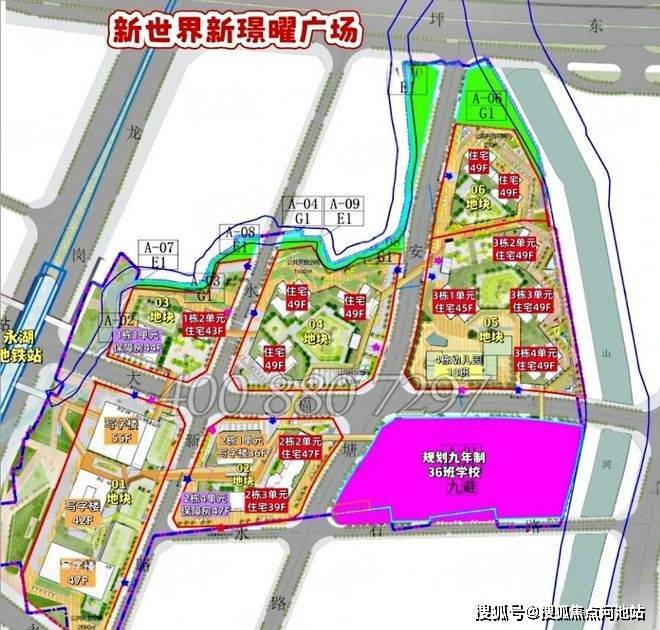 这几个地块在后期都会有风雨连廊连接在一起,直接接驳到地铁站,红色地块的是1所九年制公办学校,目前还是一片空地,没有公布出来具体学校。