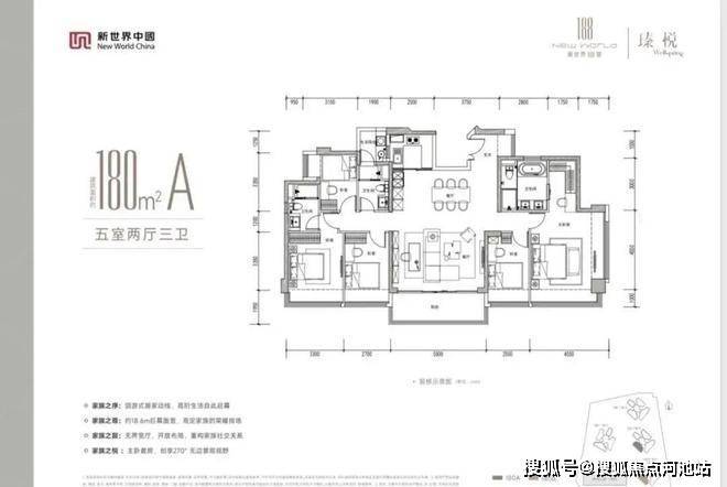 180㎡的5房2厅3卫,设计的是竖厅双龙抱珠格局,客厅5.5米开间,LDKB一体化设计,五开间朝南,约18.6米巨幕面宽,双主卧套间,分别做到了主卧30.5㎡/次卧15.45㎡/次卧11.75㎡/次卧10.87㎡/次卧8.5㎡(包含墙体飘窗),U型厨房,公卫带1个生活阳台约3.89平,阳台约10.73㎡西南朝向。