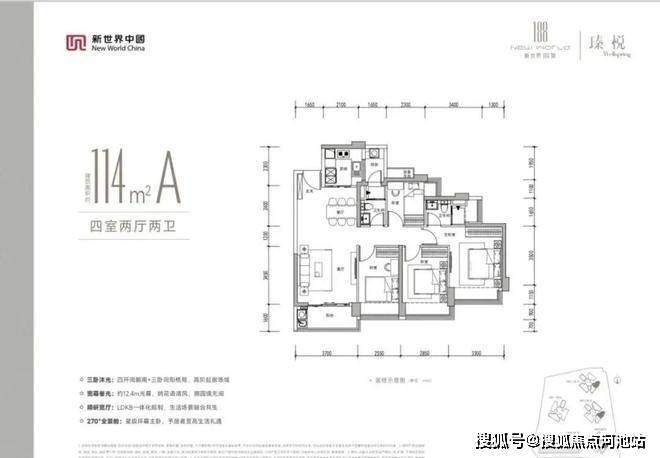 114㎡的4房2厅2卫,设计的是竖厅格局,客厅3.7米开间,LDKB一体化设计,动静分区,四开间朝南,分别做到了主卧17.34㎡/次卧12.68㎡/次卧11.35㎡/次卧7.42㎡(包含墙体飘窗),U型厨房,卫生间干湿分离,同时带1个阳台约3.79㎡+设备平台约1.2㎡,阳台约5.92㎡东南朝向。