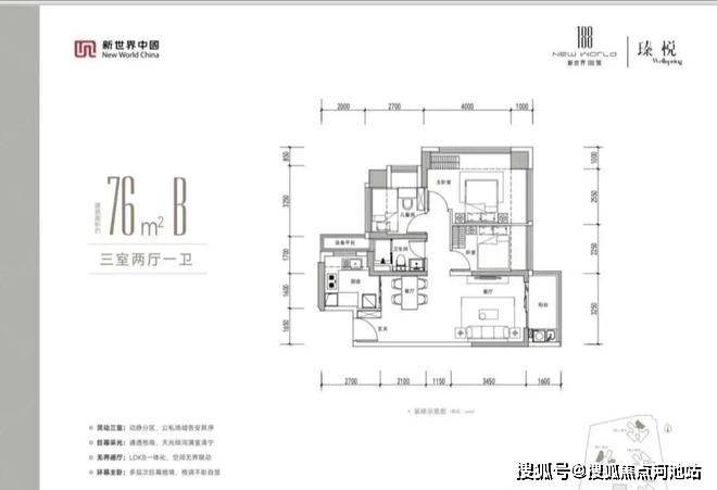 76㎡的3房2厅1卫,设计的是竖厅格局,客厅3.3米开间,LDKB一体化设计,动静分区,分别做到了主卧12.3㎡/次卧11.02㎡/次卧8.28㎡(包含墙体飘窗),U型厨房,卫生间干湿分离,同时带1个设备阳台约1.5㎡,阳台约5.28㎡东北、西北或东南朝向。