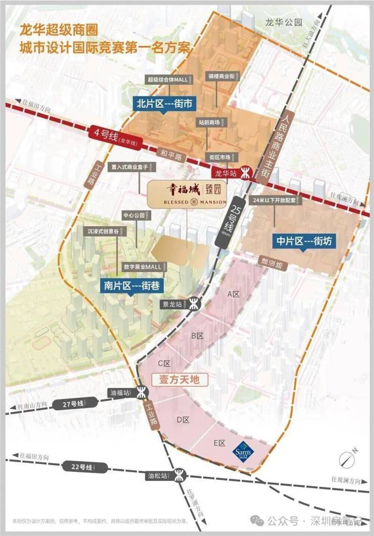 龙华商业中心城市更新是深圳重点规划的"都市核心区"组成部分,被纳入《深圳市国土空间总体规划(2021-2035年)》的北部发展核心。该旧改项目是龙华的"巨无霸",总体量达161万㎡,规模仅次于鸿荣源壹城中心,由幸福城、鸿荣源尚云、金地宸峯府、中洲等开发商共同开发,呈"品"字形分布,形成连片高端住宅区。