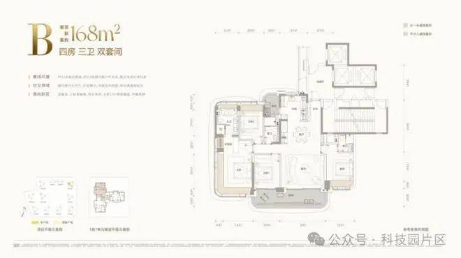 主阳台开间约8.2米,客餐厅开间约5.2米。专梯入户,三梯三户。南北通透,双套间设计,动静分区清晰。西南朝向看小区园林,更安静私密。